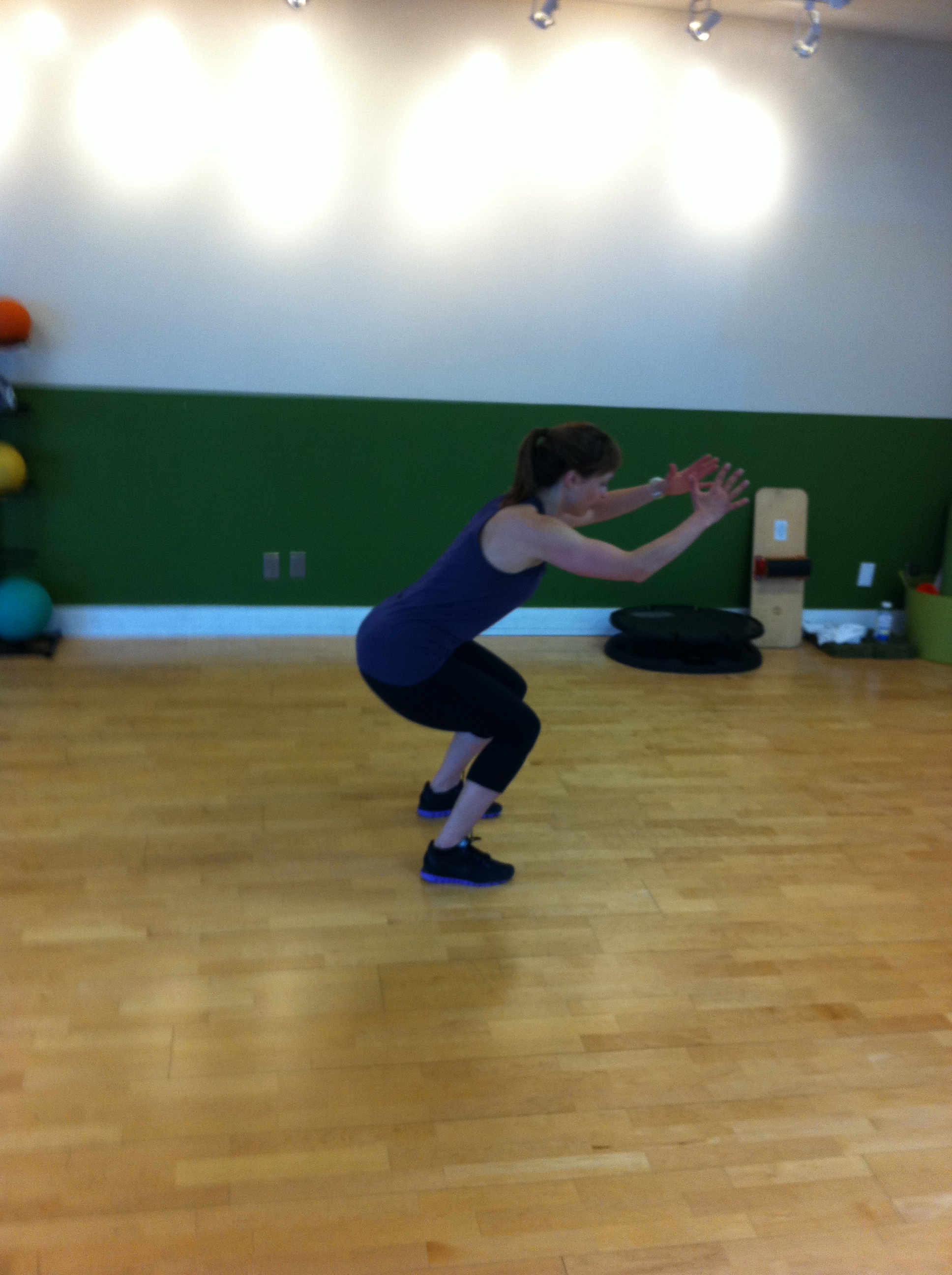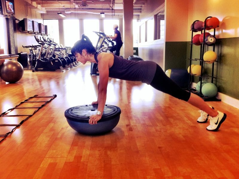 -pushing up through your heels, press bosu up over your head with a jump.