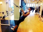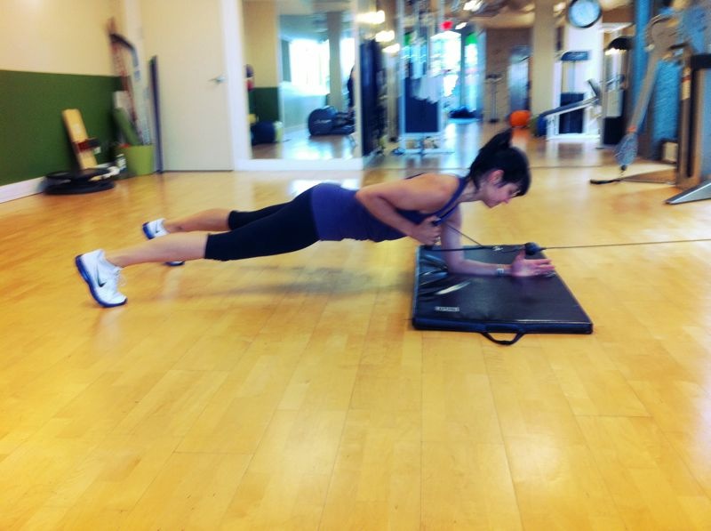 -Holding plank on your forearms, stabilize by pull your belly button in towards your spine, extend one arm and reach for cable pulling it into a single arm row, elbow squeezed to your rib cage