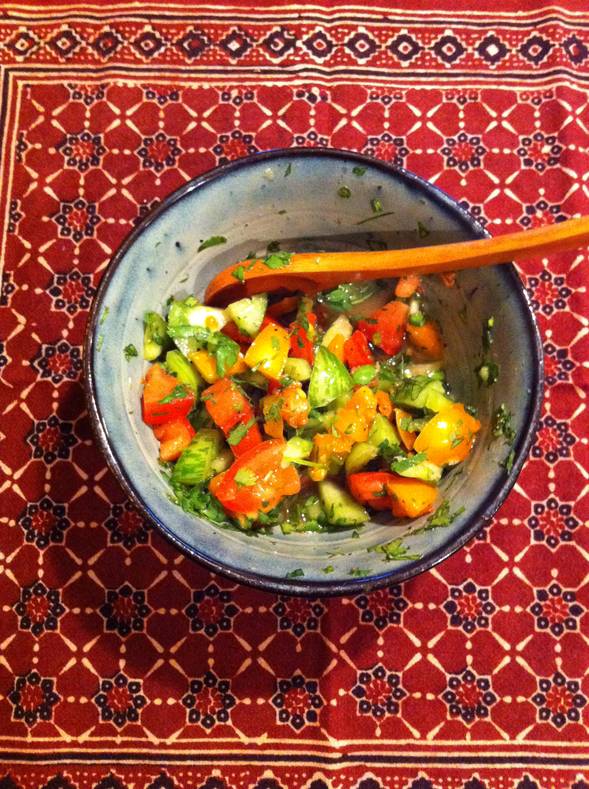 I found a beautiful medley of organic heirloom cherry tomatoes at the farmers market so I chopped them up, added fresh garlic, onion, cilantro, lime juice, jalapeno and salt…Delicious!!