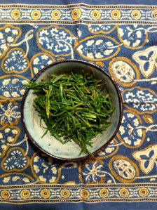 To prepare the sea asparagus blanch them in boiling water for five minutes then rinse with cold water. I sauteed some garlic scapes and chili flakes in coconut oil then tossed in the sea asparagus for a few minutes and that’s it! So delicious and nutritious 🙂