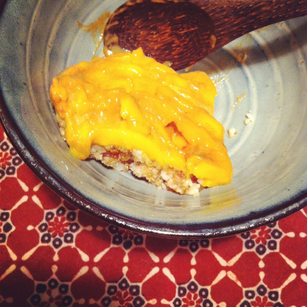 Place mango mixture evenly over the crust & chill in freezer to allow filing to set.
