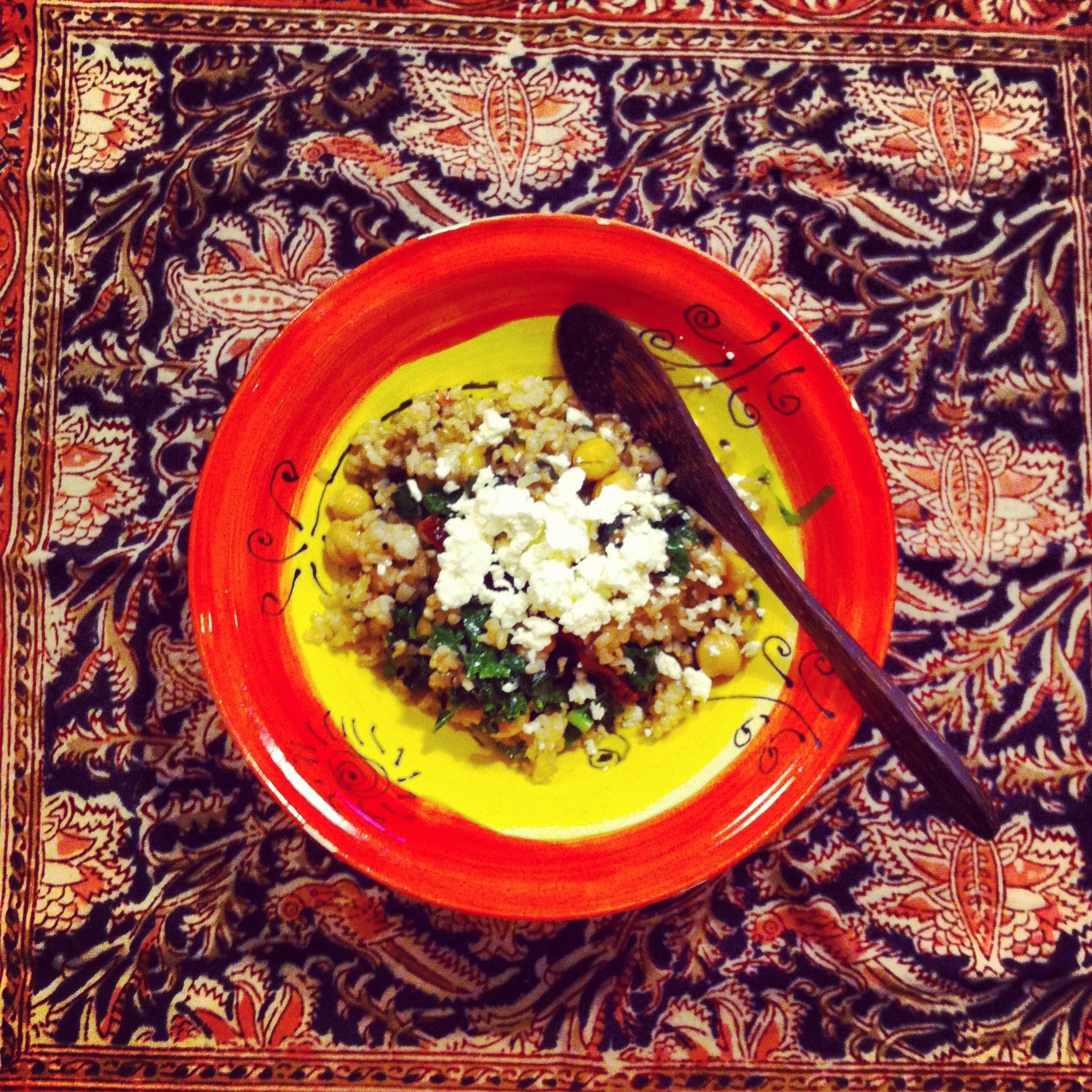 Use your leftover grains & turn them into a delicious meal. I had extra brown rice that I wanted to use up so I sautéed 2 garlic cloves & 5-6 sun dried tomatoes in coconut oil for a few moments. I then added a couple of big handfuls of chopped mixed greens. I stir fried the greens until they were slightly wilted then folded in the cooked rice. I had a can of organic chickpeas in my cupboard so I tossed about a cup of them into the mixx for extra protein & sprinkled in some black sesame seeds. You can experiment with different beans or tofu as well as regular sesame seeds. I finished the preparation off with Braggs to taste ( or tamari soy sauce ) & crumbling feta cheese ( optional ) on top …so yummmmy!