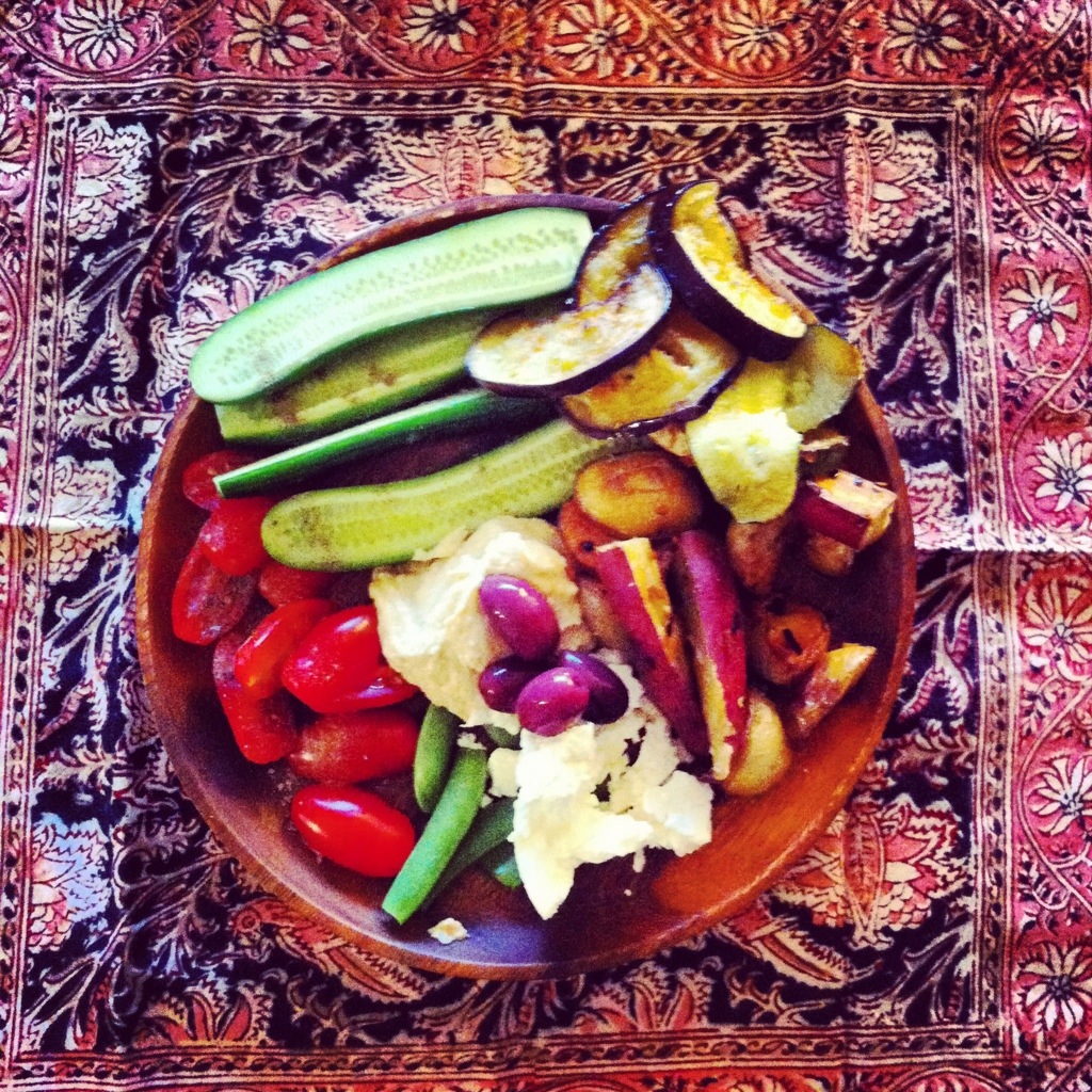 This was so satisfying! I tossed new & sweet potatoes with fresh garlic, chili flakes & olive oil then roasted them in the oven until golden & crispy. In another pan, I grilled eggplant & zucchini. I made a platter with the roasted veggies, sliced baby cucumber , cherry tomatoes, snap peas, a big dallop of hommus, crumbled feta cheese & fresh olives. Cracked some Himalayan rock salt & fresh pepper over everything & voila! You can also add whole wheat pita or Persian flat bread.