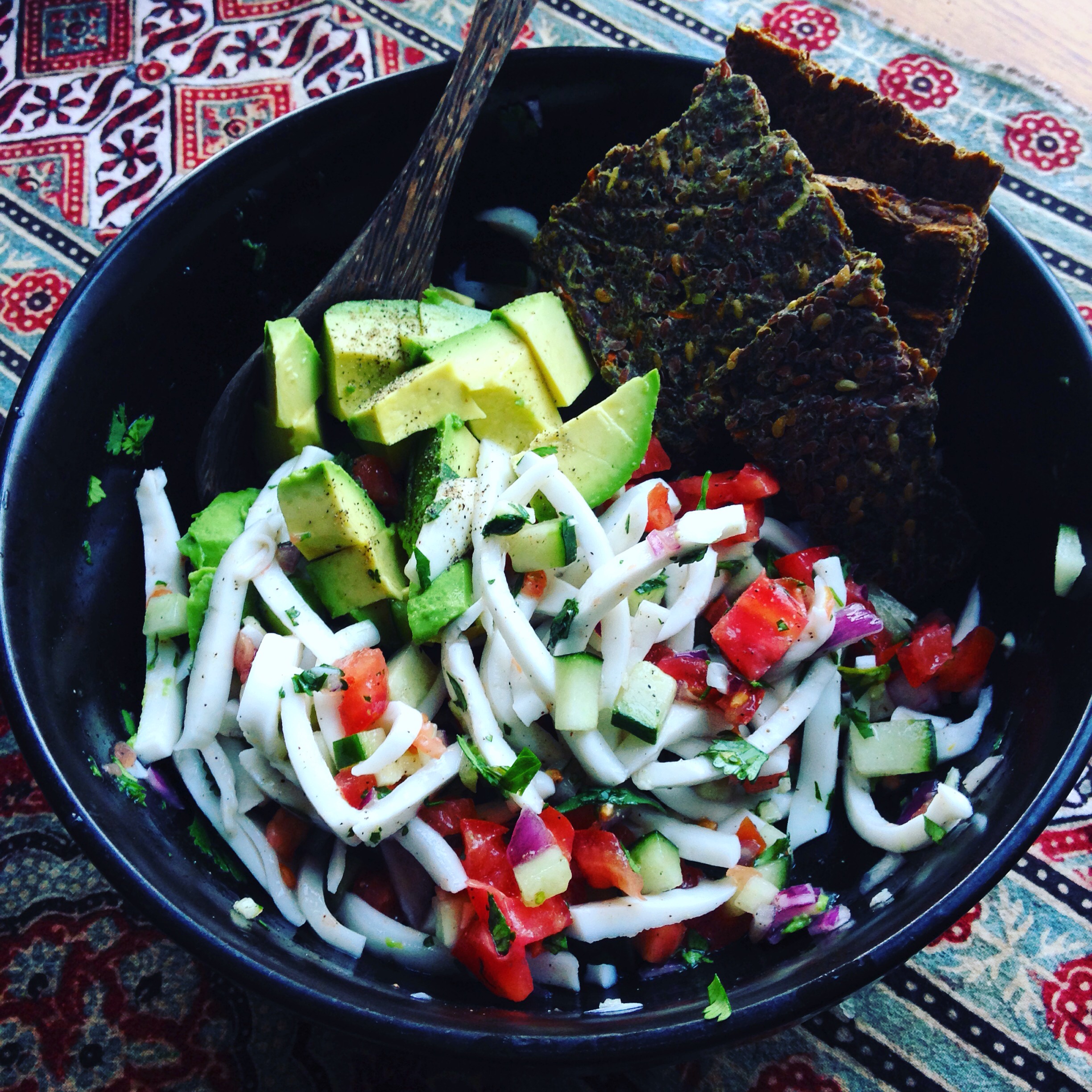 Combine all ingredients in a large bowl… Enjoy with cubed avocado & raw crackers or corn chips. 💣
